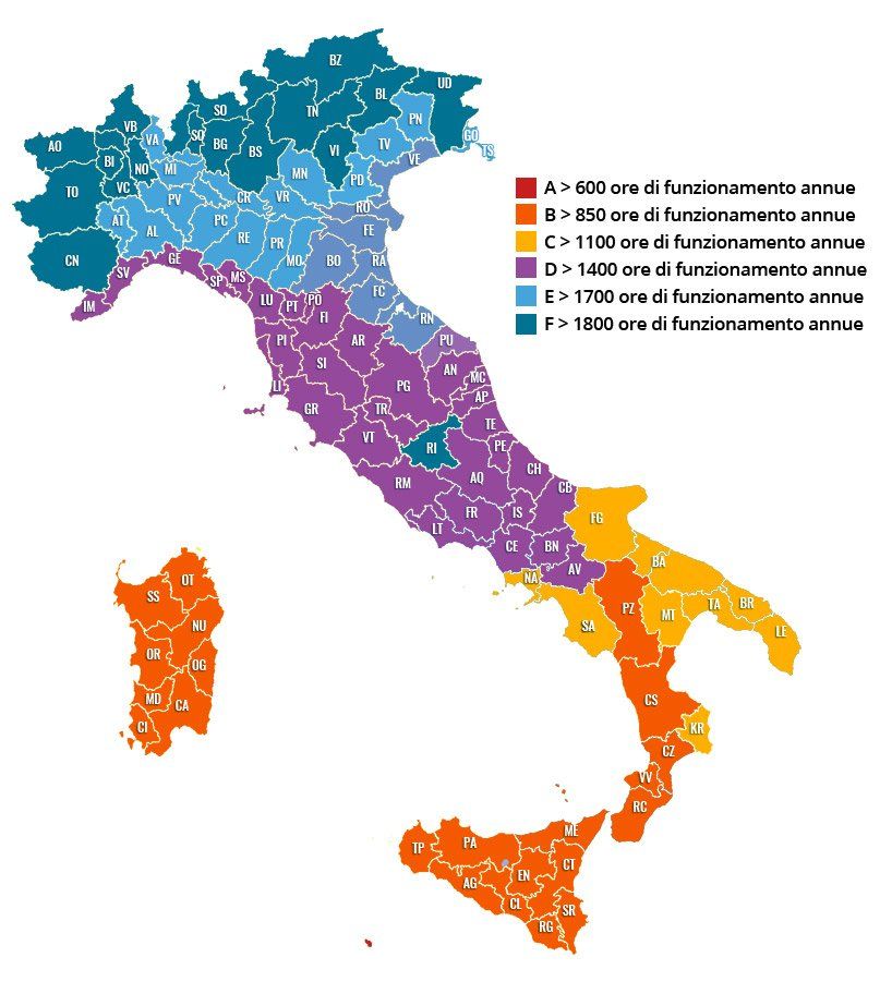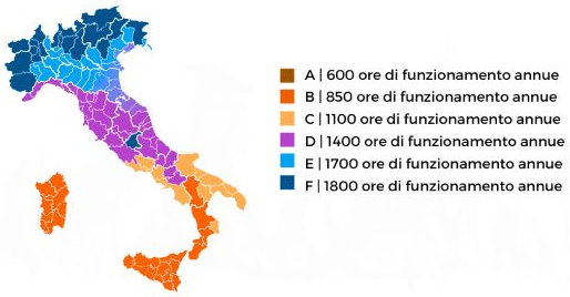 Il contributo garantito dal Conto Termico varia a seconda della potenza dell’apparecchio, delle sue emissioni e della zona climatica in cui sarà installato. Lo scopo è quello di regolamentare le fasce di consumo di energia su tutto il territorio nazionale, identificando zona per zona le temperature medie. Le zone identificate sono 6, e vengono espresse con delle lettere, dalla A (minor consumo) alla F (maggior consumo).